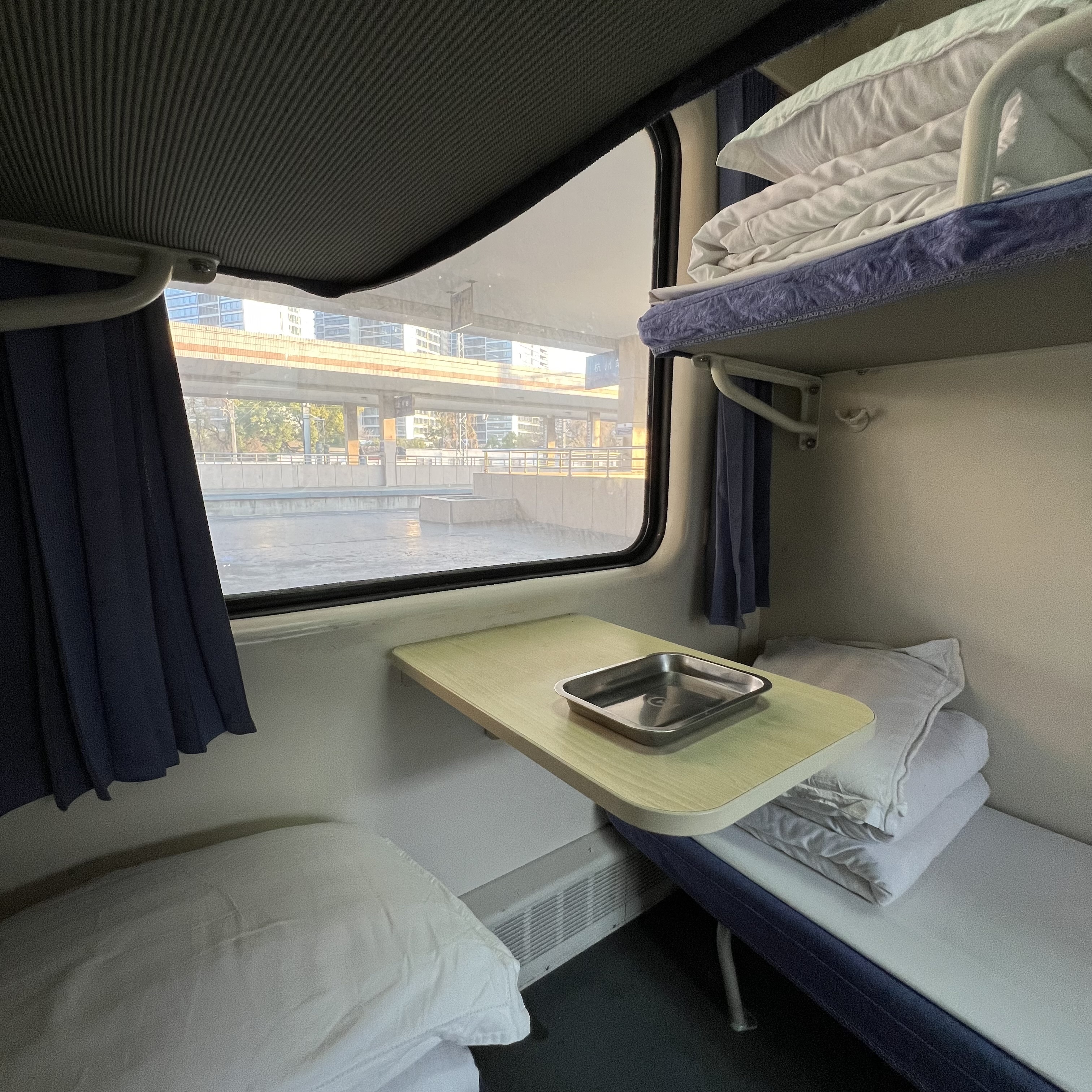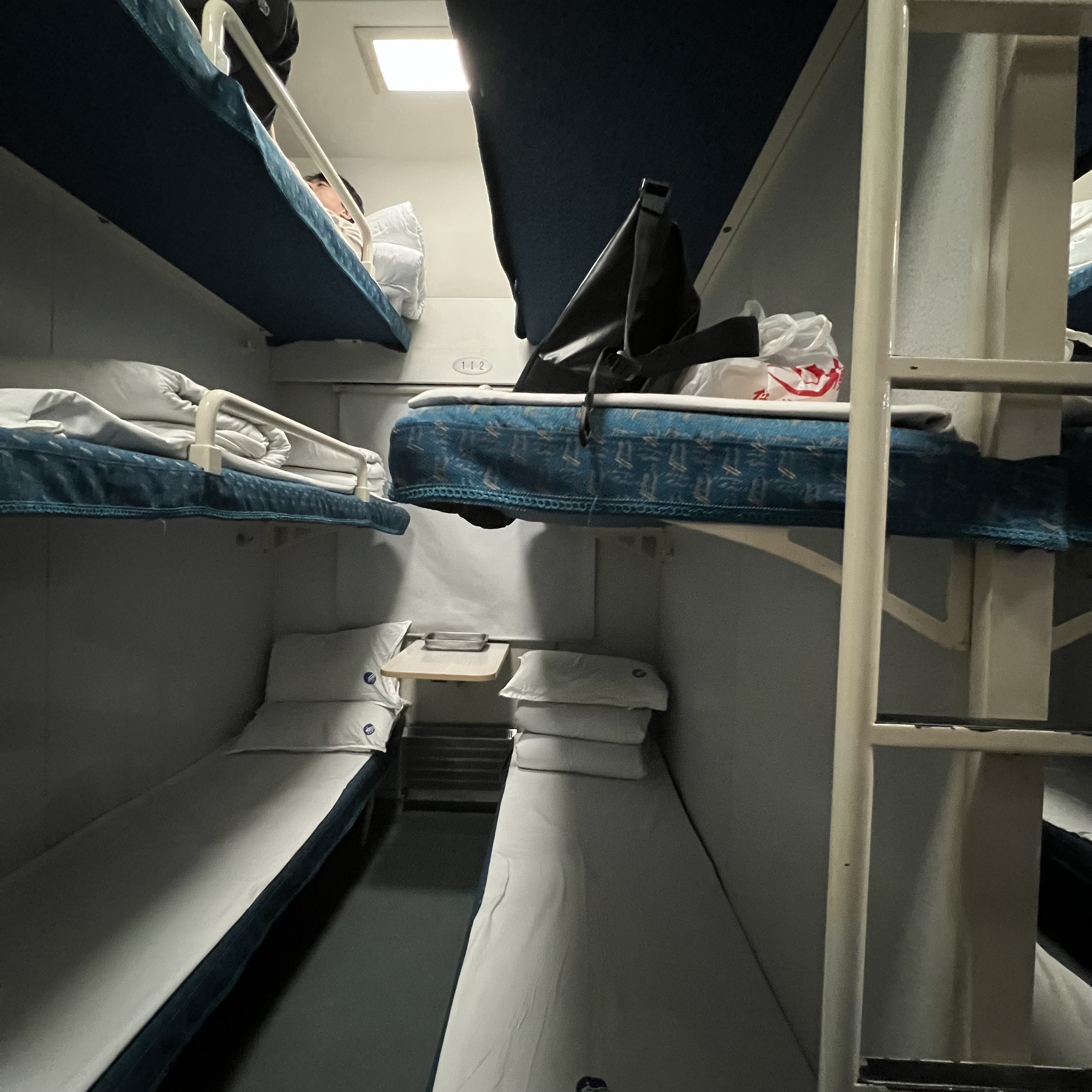 内部也如我想象的一样,上个世纪的模样,也不知道这辆绿皮火车服役了多久,我被分到中铺,一开始我以为是个好位置,但是看了床位之后才发现远超我的想象,真的就如同棺材,躺进去腰是直不起来的,但是好在火车上暖气很足,晚上不用盖被子也不会觉得冷