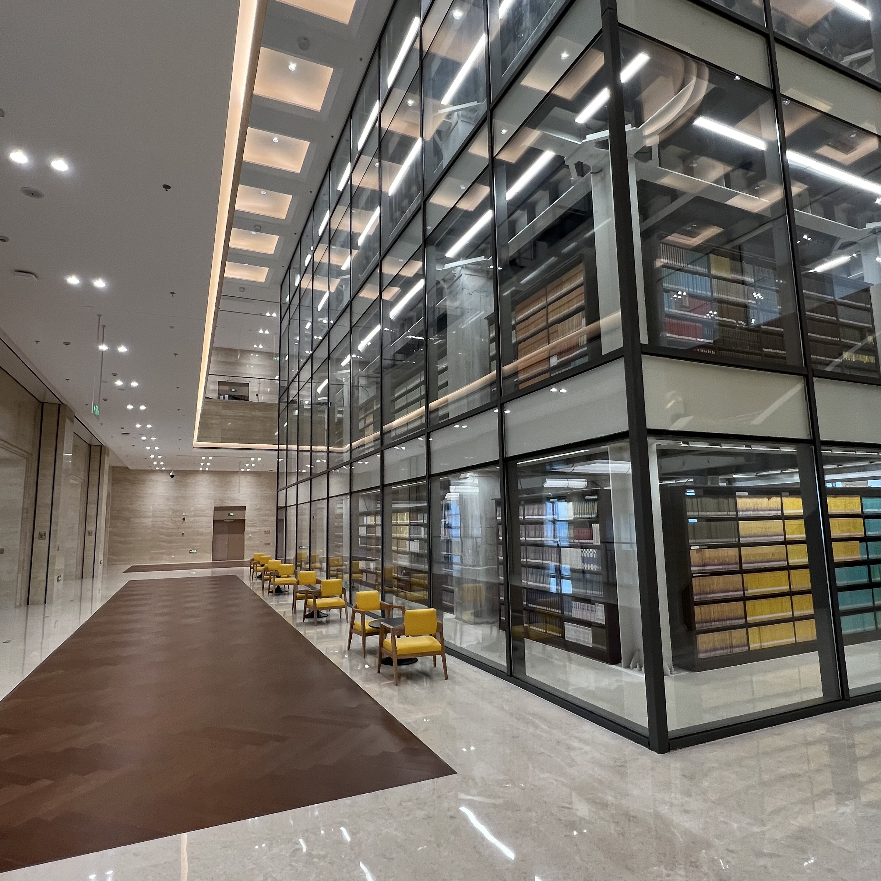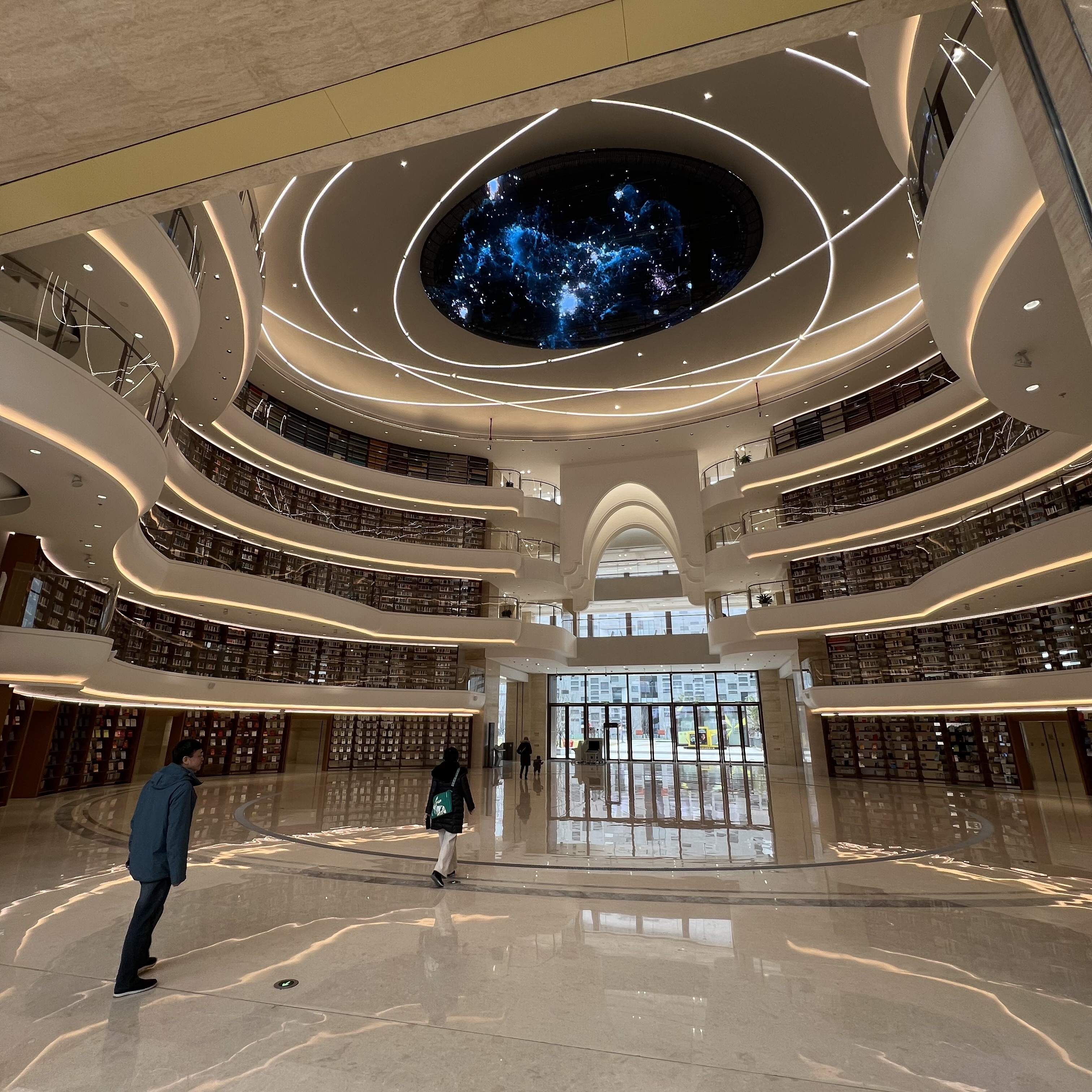 图书馆也是还在建设中,南门没有开,只能从北门进入,进去很简单,过个安检就可以了,进去后着实惊呆我了,大厅的设计非常震撼,天台是一块大屏,描述不出来,直接上图。